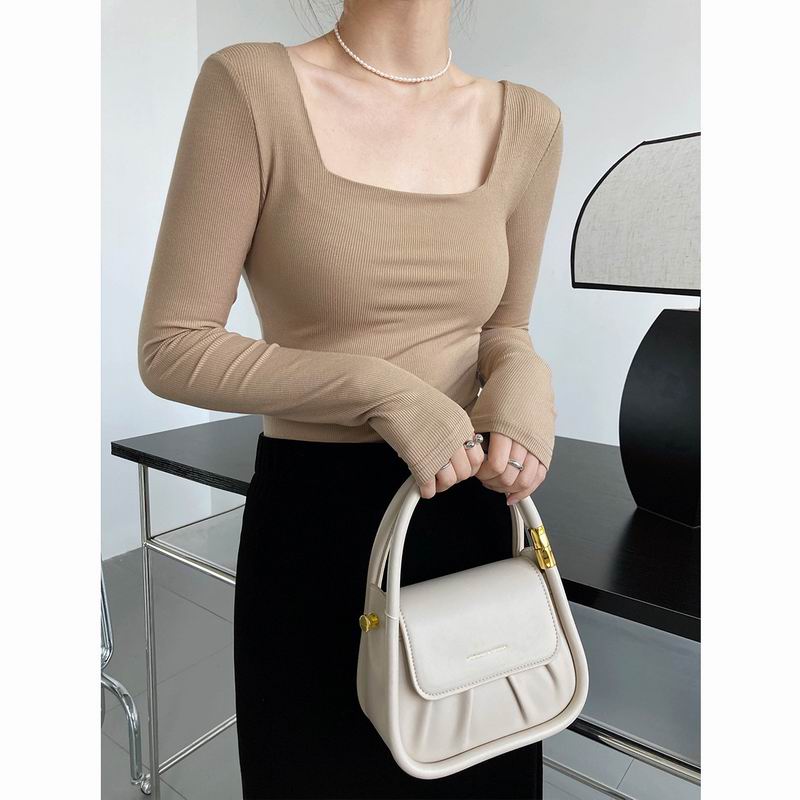 Design sense long sleeve square neck t-shirt female slim exposed collarbone short top base